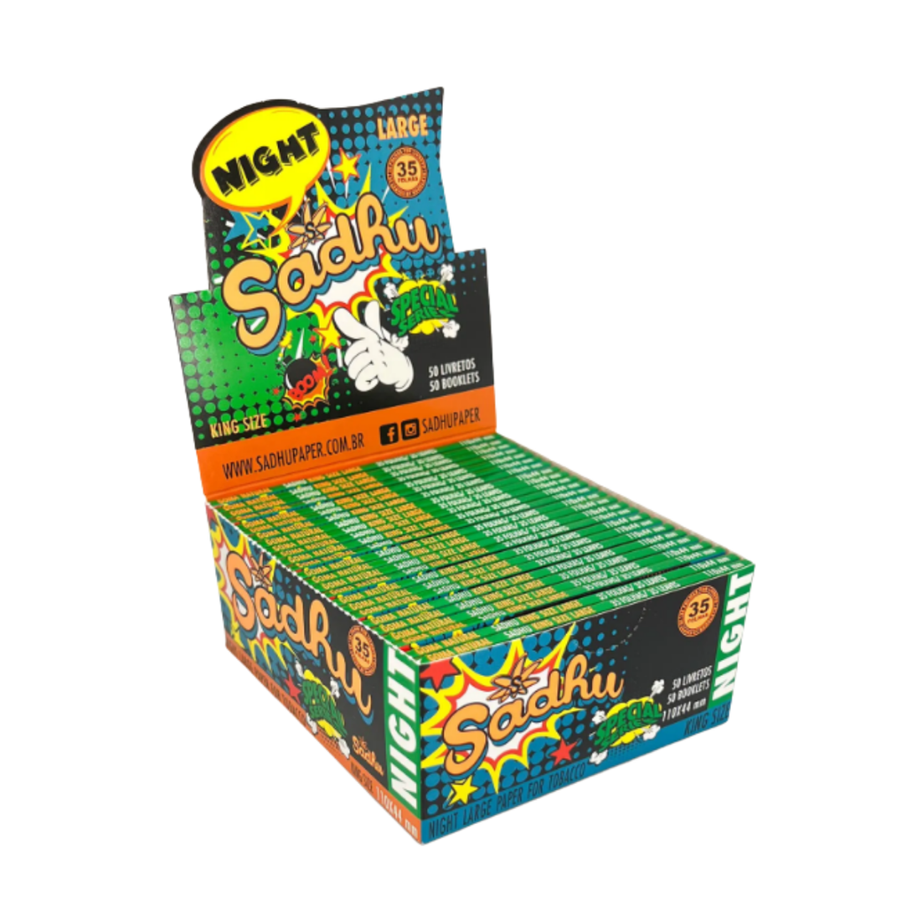 Assim como a Sadhu Black, a versão Night conta com 35 folhas de papel branco largo, com 44 mm de largura, ideal para enrolar cigarros mais robustos.